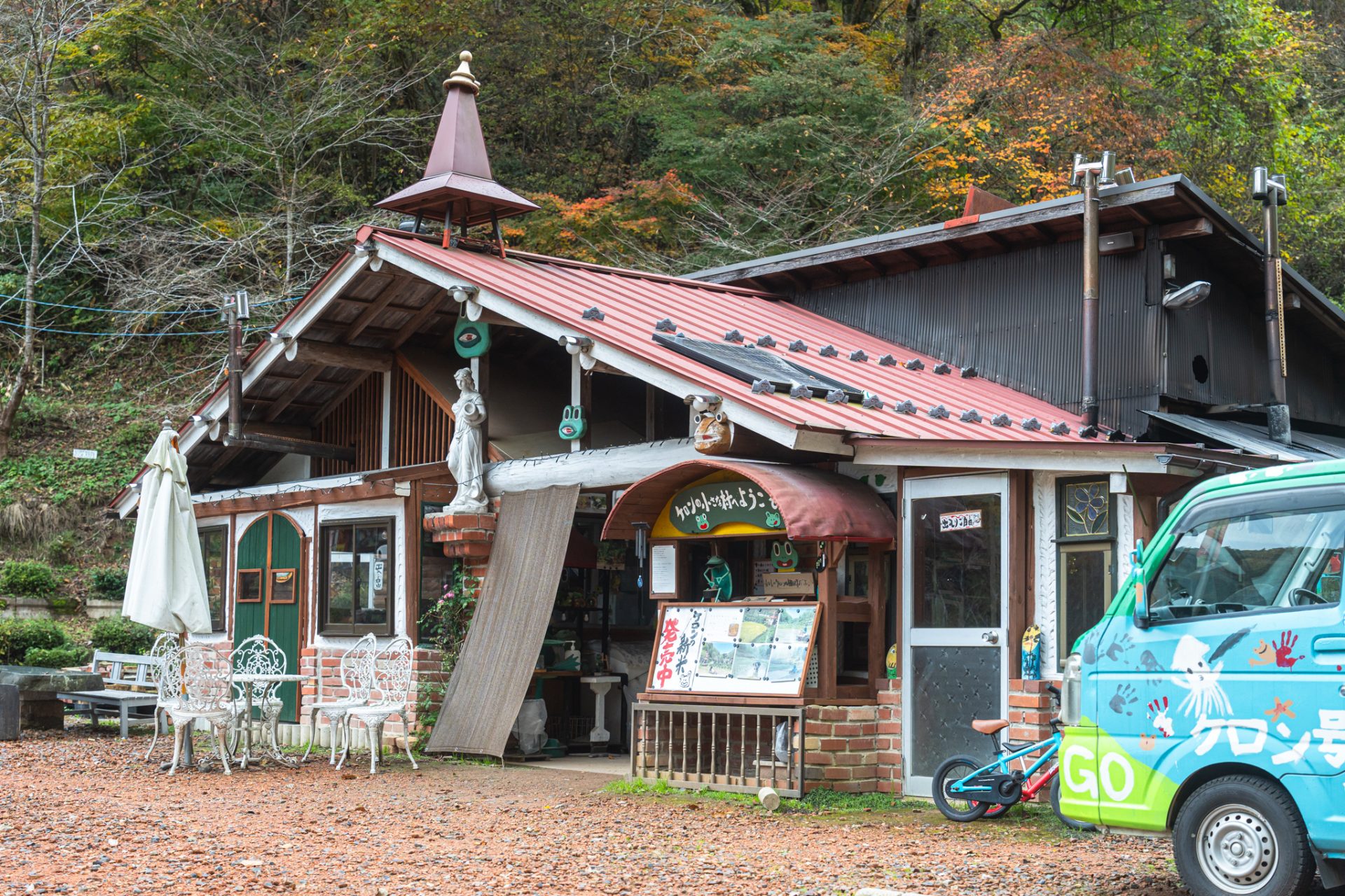 案内してくれたのは、2代目村長の古矢 拓夢(ふるや たくむ)氏です。ここは元々、古矢の祖父 上乗秀雄氏が定年後の趣味として、耕作放棄地だった谷を切り拓いて作った場所。水が湧き出るこの地を「カエル(ケロン)」を主人公にした遊び場として開放し、長年地域の子どもたちに愛されてきました。