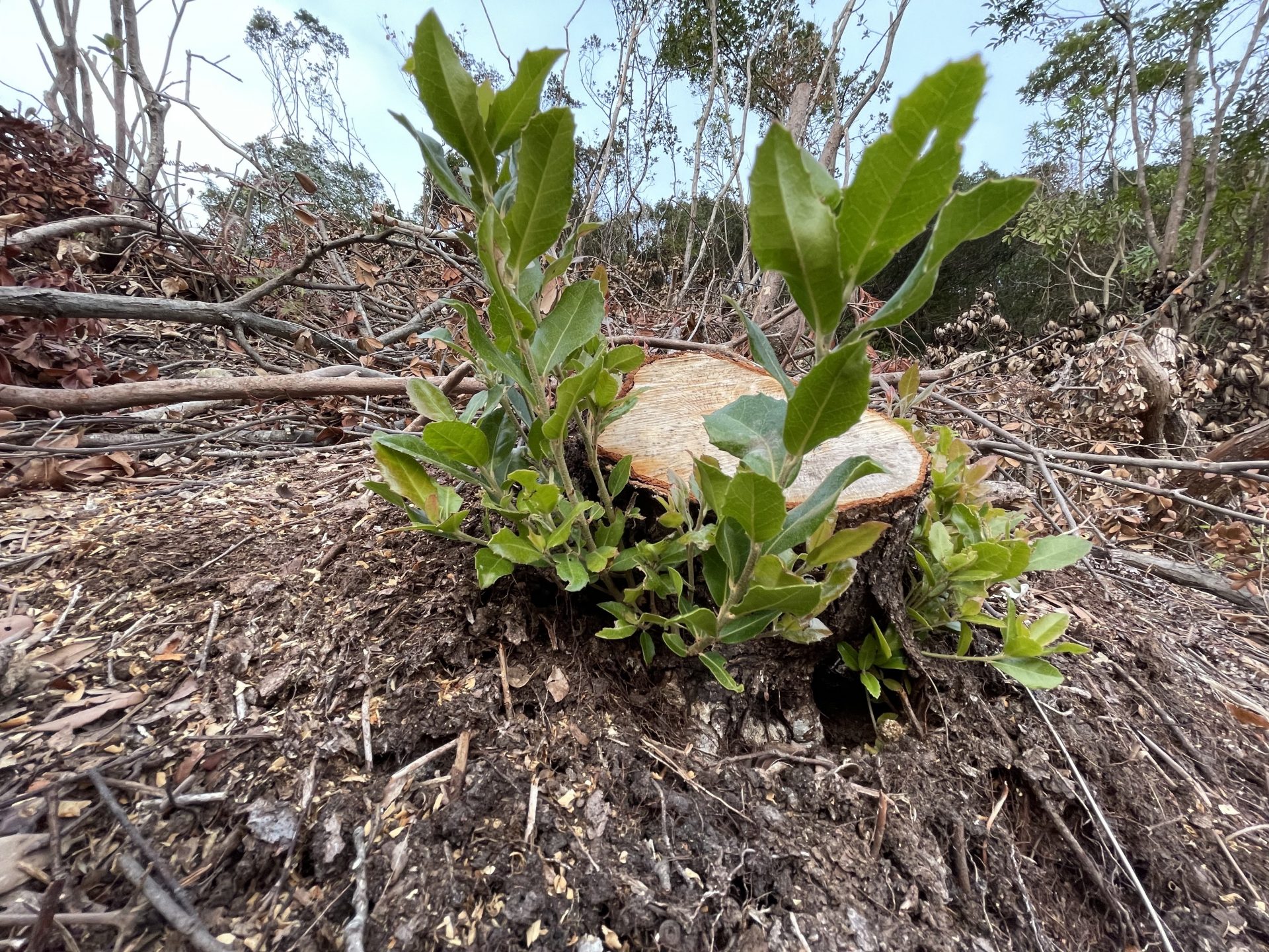 樵木林業の最大の特徴は「択伐矮林更新(たくばつわいりんこうしん)」と呼ばれる伐採技法です。すべてを切る「皆伐」ではなく、胸高直径が約3cm以上の優良な幹だけを選択的に伐採し、細い幹は残します。ウバメガシなどの広葉樹は、杉やヒノキなどの針葉樹と違い、切っても切り株から再び旺盛な若い芽が生えてくる「萌芽更新(ほうがこうしん)」という驚異的な再生能力を持っています。